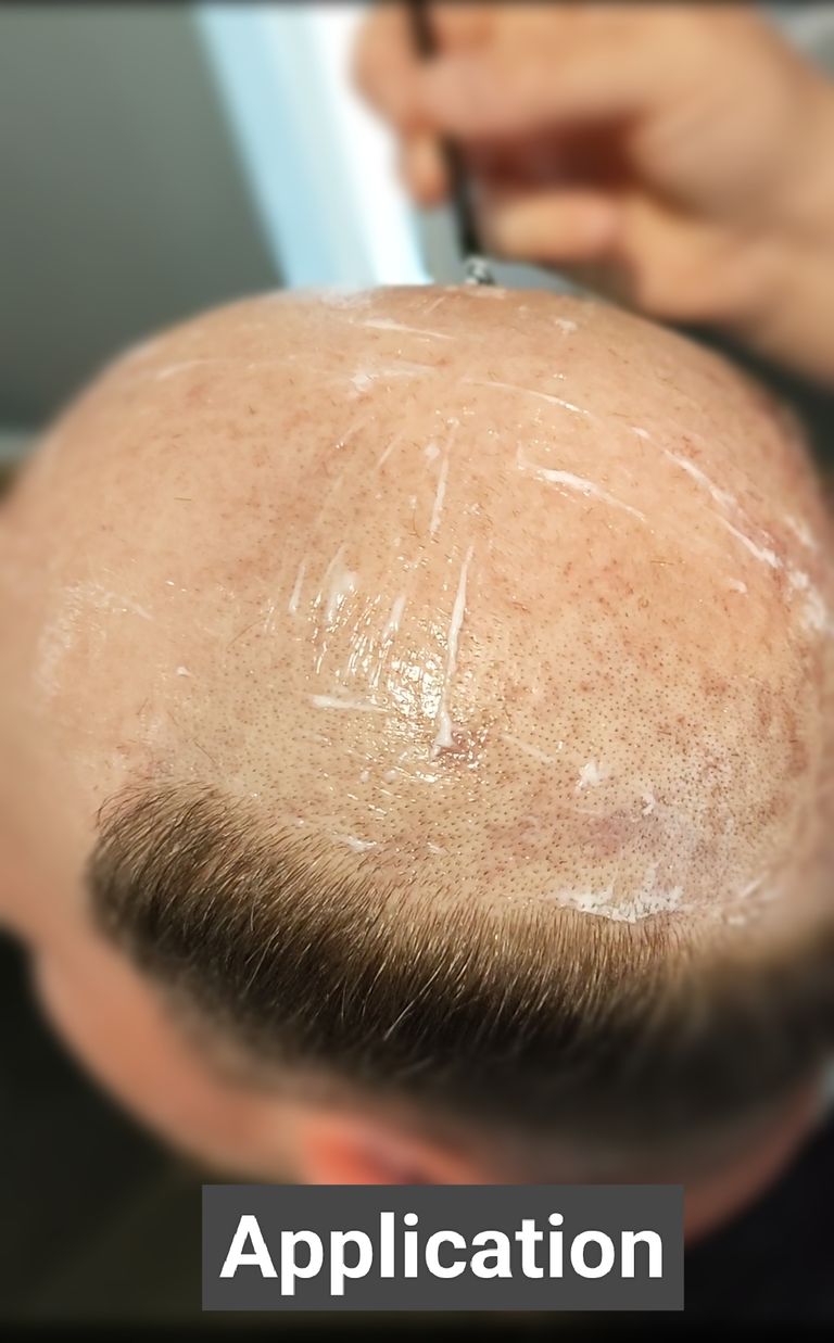 Using a water-based, toxin free bonding agent, the bespoke hair system is applied to the pre-treated scalp. This is a painless, gentle process using only the highest quality, skin-friendly, products on the market, designed to comfortably hold the system in place.